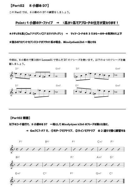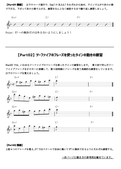 ジャムセッションで最も演奏される「Fブルース」のアドリブの練習方法を、8章のレッスンにわたり説明。ここ10年にわたる実レッスンでの経験を基に今回の講座に内容を反映させ、Fブルースをバリバリアドリブできるようにするカリキュラムに仕上げました。